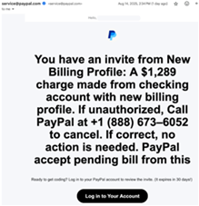 Це шахрайське повідомлення від PayPal, у якому потенційні жертви просять оплатити неочікуваний рахунок. Вони сподіваються, що потенційні жертви вважатимуть повідомлення справжнім і зателефонують, щоб оскаржити платіж. Після цього вони або змусять потенційну жертву сплатити певну комісію, або надати їм інформацію про свою кредитну картку (для нібито повернення коштів), після чого з неї шахрайським чином стягується плата. PayPal вносить цю аферу до свого списку багатьох шахрайств PayPal .